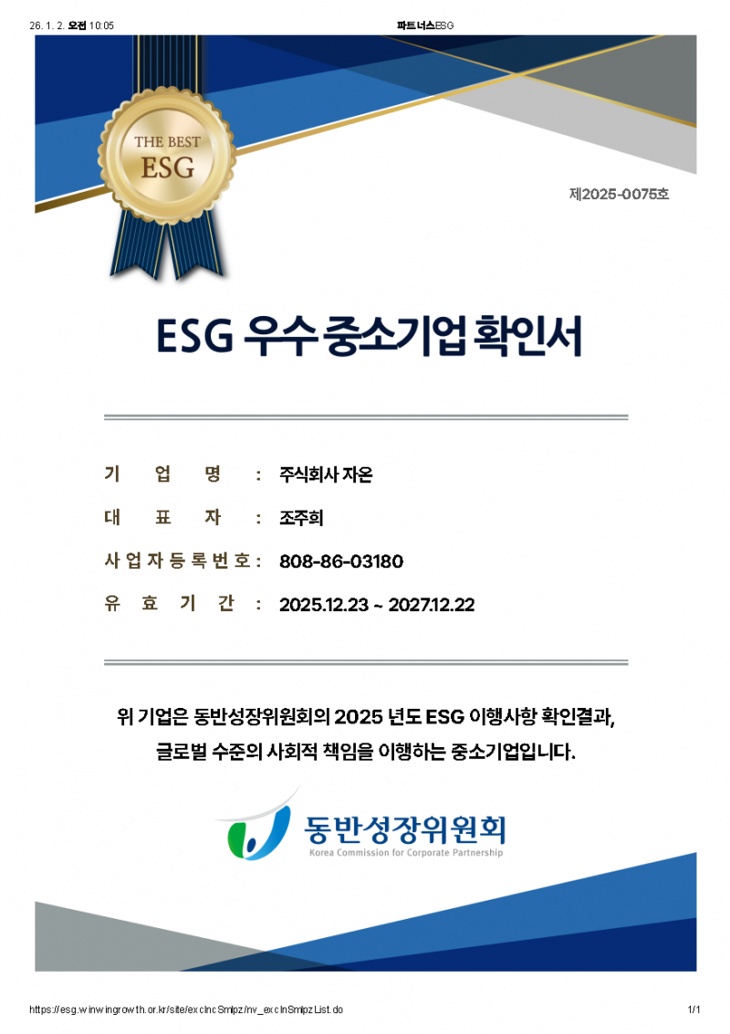 주식회사 자온이 동반성장위원회로부터 ‘ESG 우수 중소기업’ 확인서를 수여받았습니다.